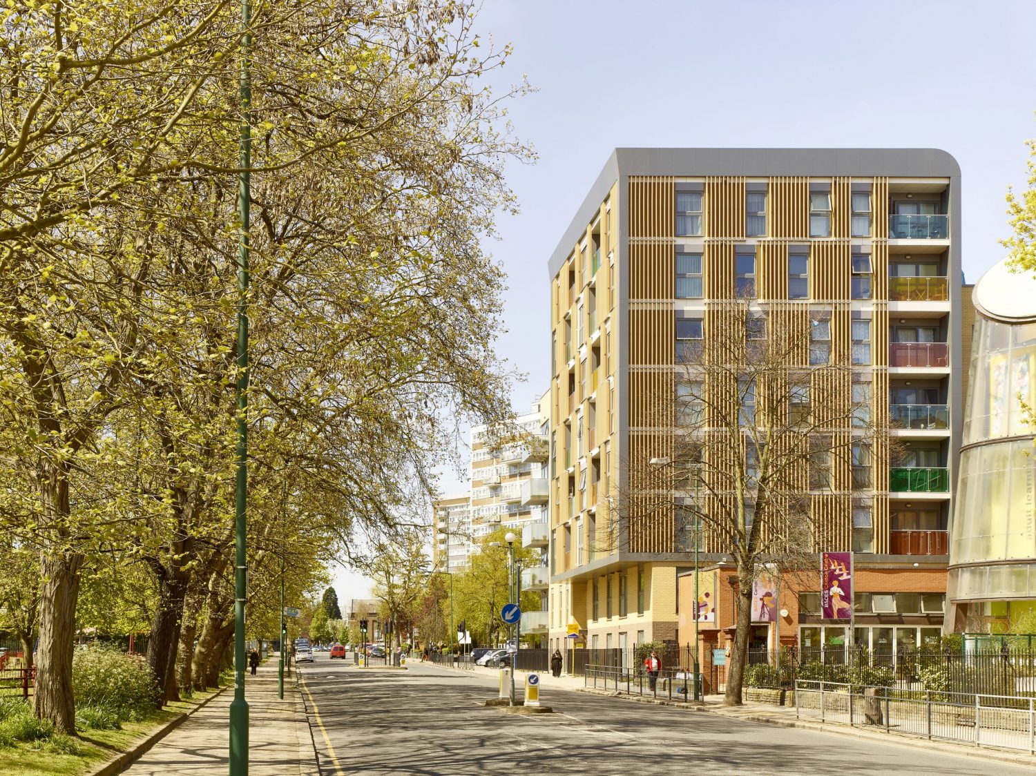 Articulated timber clad upper storeys sit on a brick plinth, made up of two volumes.